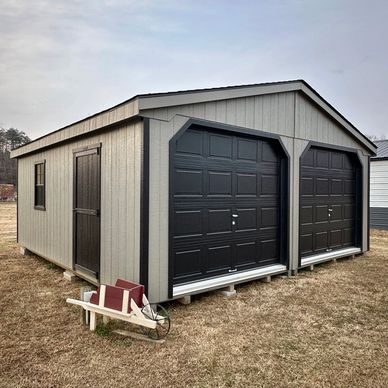 3' door, 5' double door, (2) 18"x27" black frame windows, painted doors, gable vents (#6037)