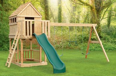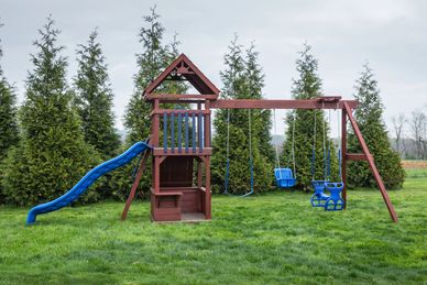 Most playsets include a tower which is pre-assembled prior to delivery. Playset deliveries are made using a truck/trailer which requires access to the area you want the playset placed, free from obstructions such as trees, other structures or not having large enough gate openings. Remaining attachments such as slides & swing frames will be assembled on site. Playsets must be placed on level ground, we WILL NOT level any component of a playset using cinderblocks ofor the safety of your children.