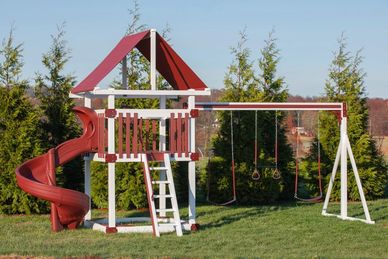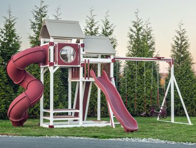 Vinyl & Wood playsets are priced exactly as shown in photos, local delivery & assembly is included. Most sets can be customized with different swings, slides & attachments other than what is shown. Most attachments available in blue, red, yellow & green, create a unique playset for your family by choosing your own combination of options. See sales person in office for pricing on custom units. YELLOW TORNADO TUBE SLIDE IS DISCONTINUED