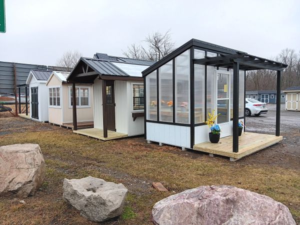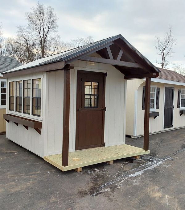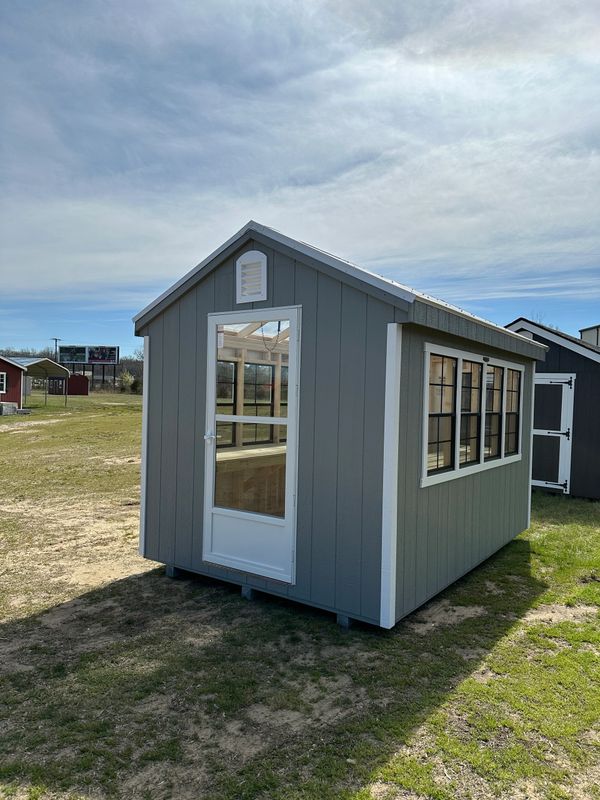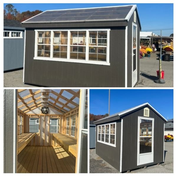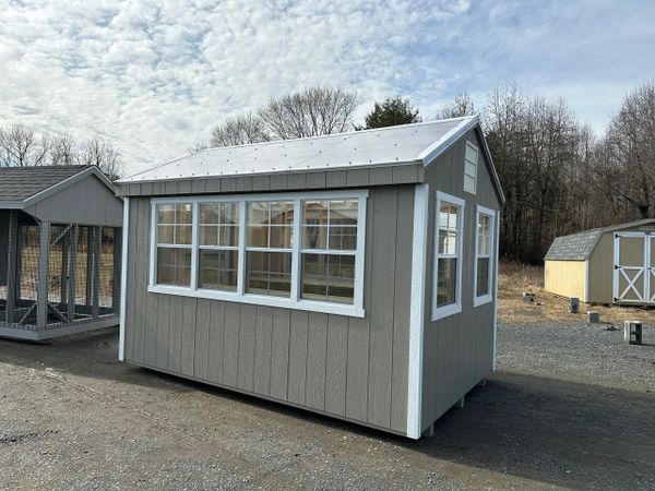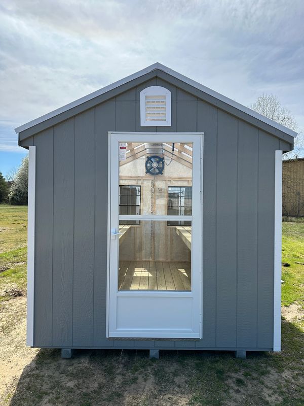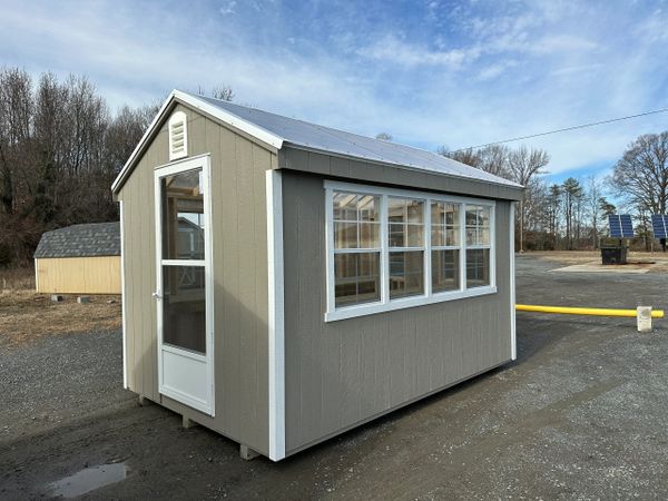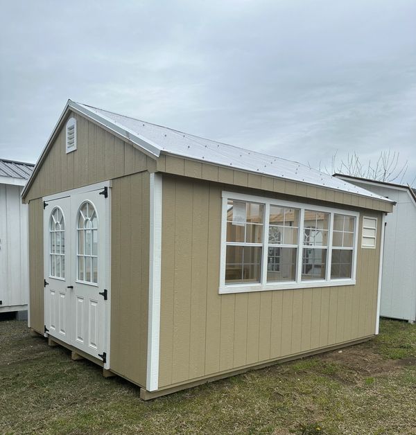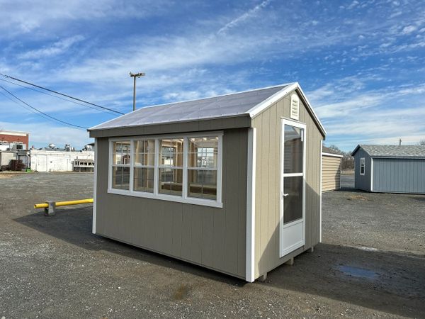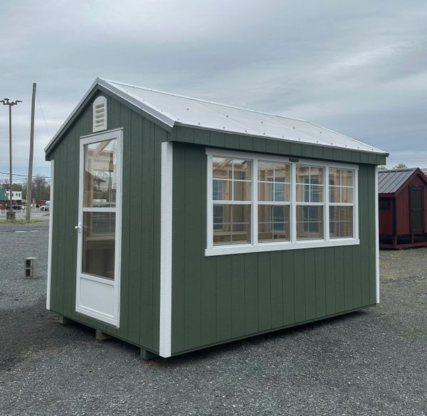 Includes: 25 year L.P. Smartsiding (engineered wood) in your choice of colors, 6 pitch roof, clear translucent roof, 16" on center 2x4 floor joists, wall studs & rafters, 1x6 pressure treated floor, pressure treated 4x4 ground skids, electric fan vent, 2x3 windows, storm door, 2 pressure treated workbenches, local delivery & set-up