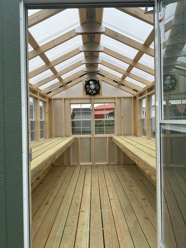 Electric fan, translucent roof, pressure treated floors & 2 potting benches standard in all greenhouses